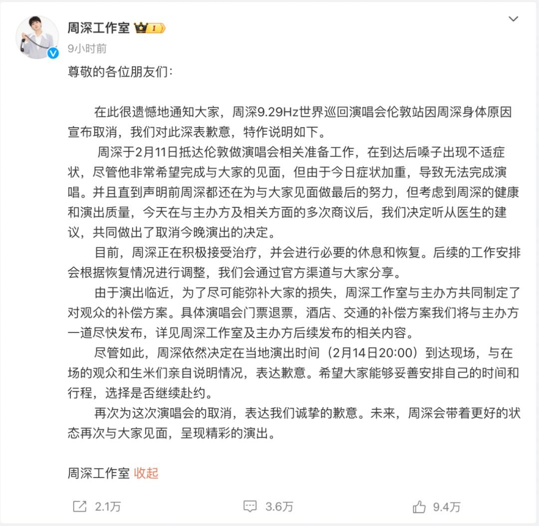 2月15日凌晨,@周深工作室 发布声明,称原定于当地时间2月14日20点(北京时间2月15日4点)的伦敦演唱会因周深身体原因宣布取消。周深在演出时间到达场馆现场,向粉丝和观众鞠躬道歉。