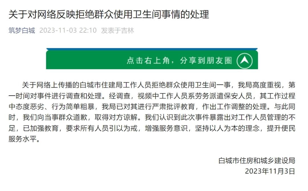 近日,有网友发布视频反映,一名群众到吉林省白城市住房和城乡建设局办事,想借用行政楼厕所,被工作人员拒绝。11月3日,白城市住房和城乡建设局正面回应:向当事群众郑重道歉,并将严肃处理当事保安。
