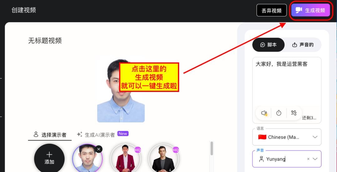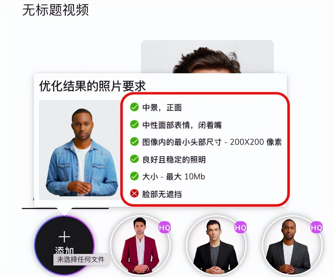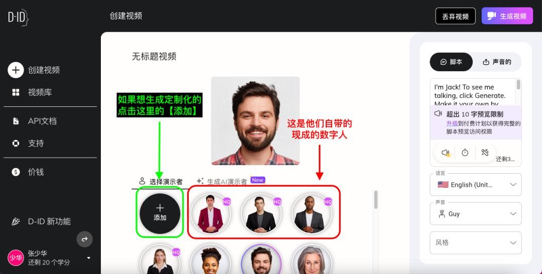 里面有很多现成的数字人。另外,你也可以点击“添加”,上传自己的头像,做定制的数字人视频。