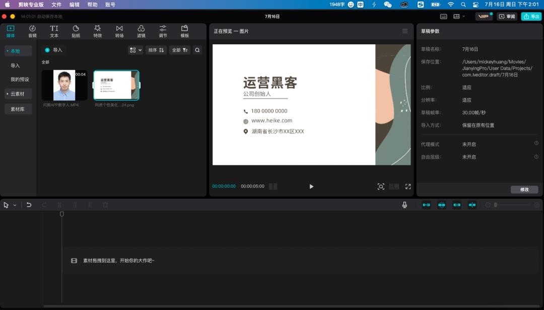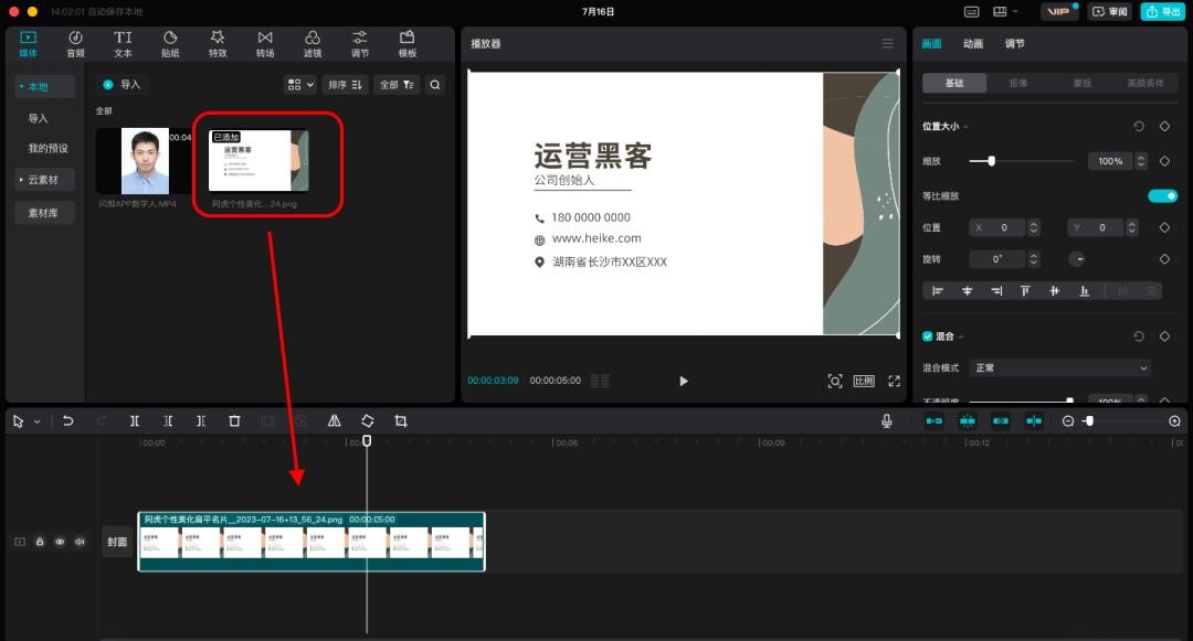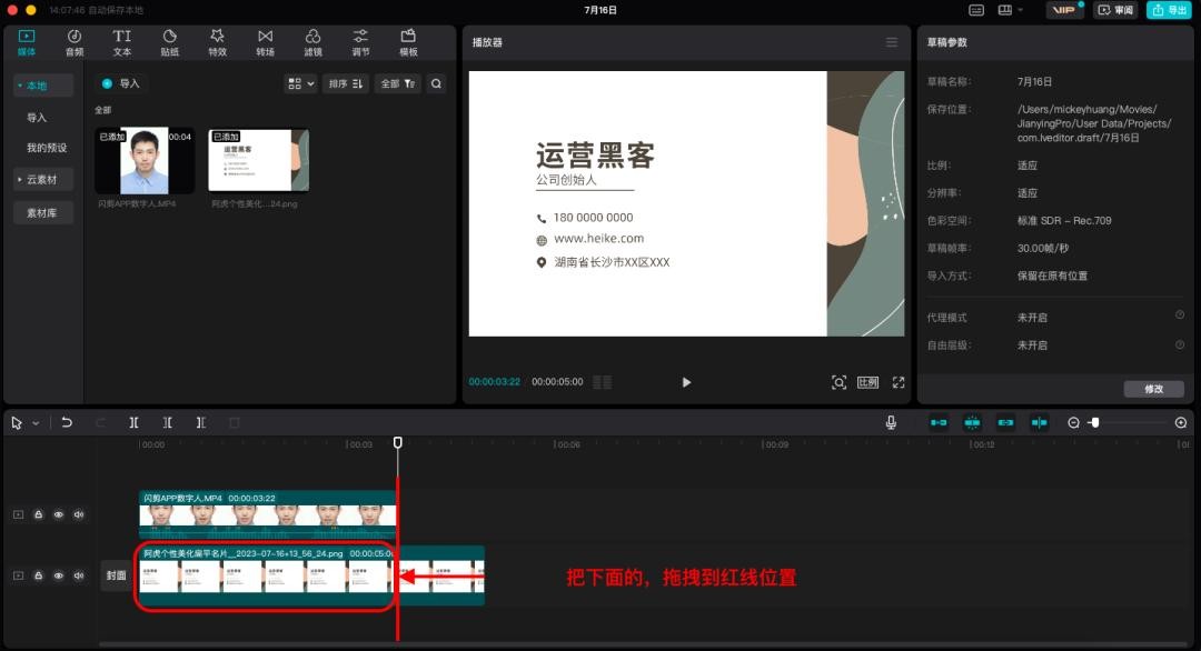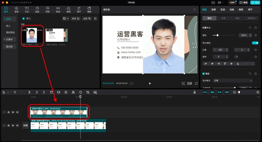 1)打开剪映,导入刚刚制作好的“名片”和第一步时制作好的“数字人视频”。
