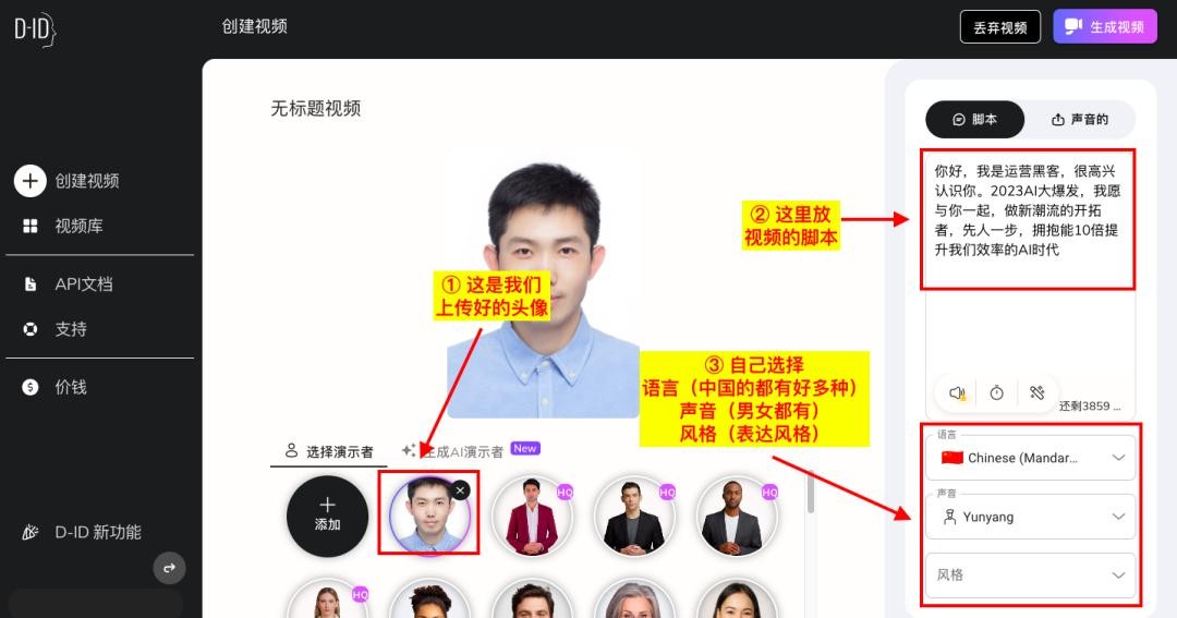 上传完成之后,在页面的右边,把你的脚本放上去。另外,下面的语言、声音、风格,可以根据自己的需求选择。