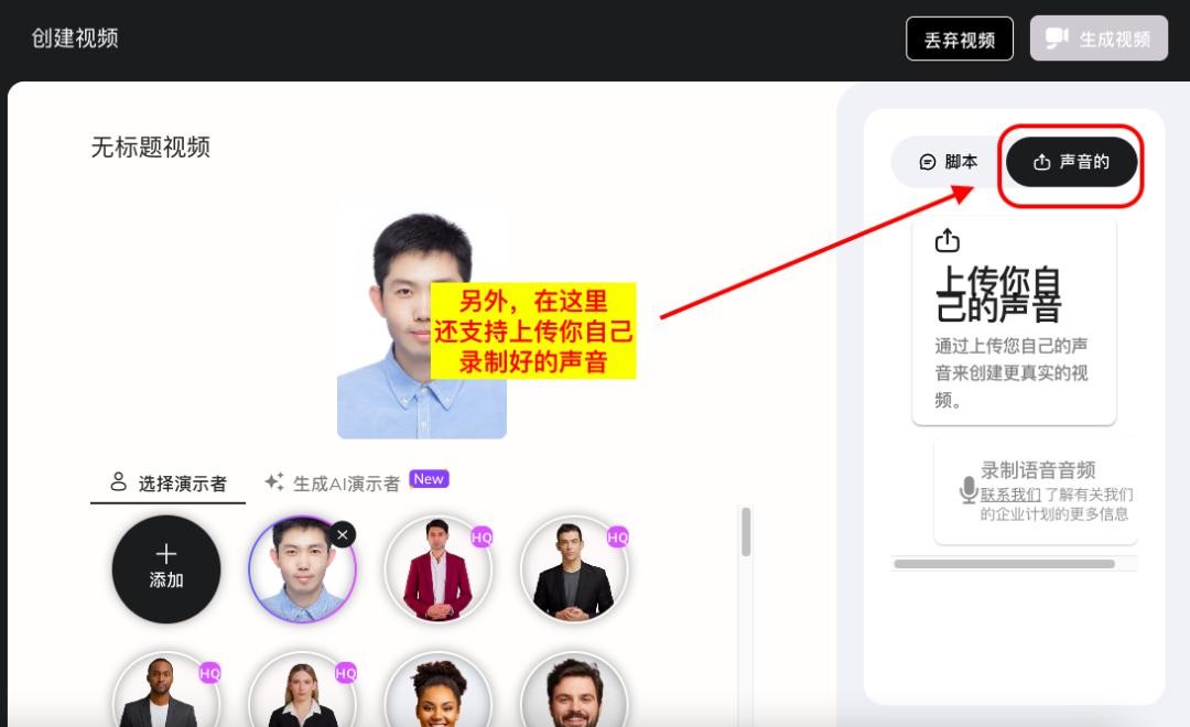 D-ID还支持上传自己的声音,点击图片上面这个地方就可以。接下来,就可以生成你的数字人视频了。