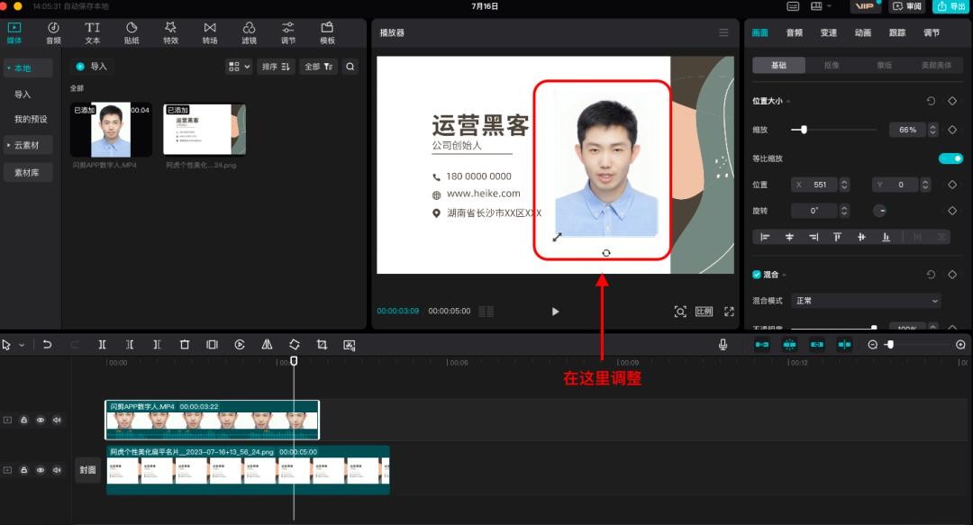 5)把“名片”的时长,调整为跟“数字人视频”一致。