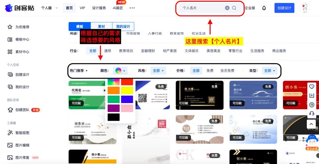 ccccccc/sah4x0lsdqh >注册/登陆创客贴后,在搜索框搜索“个人名片”,有很多现成模板可以直接套用,对质量要求比较高的朋友,还可以自己设计。