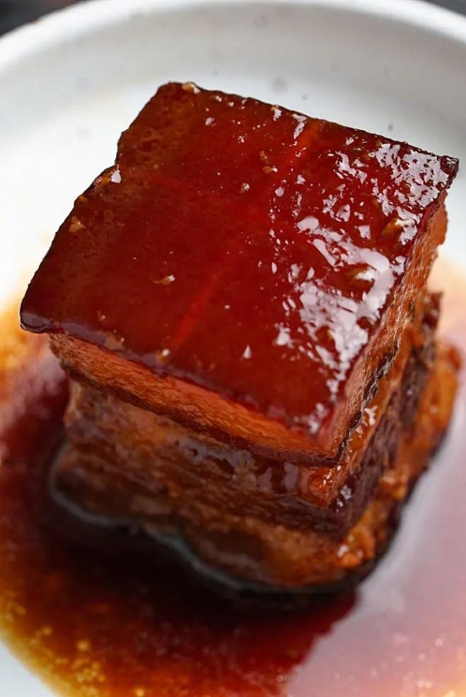 东坡肉的成品菜看起来像是一块码得整整齐齐的豆腐块儿,看起来那是色泽亮丽,红得透亮,像玛瑙一样,吃起来软而不烂,肥而不腻。