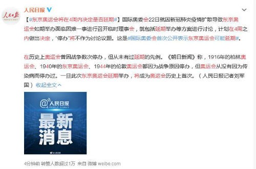 国际奥委会22日就因新冠肺炎疫情扩散导致东京奥运会如期举办面临困难一事进行召开临时理事会,就包括延期举办等方案进行讨论,计划在4周之内做出决定,“停办”将不作为讨论议题。这是国际奥委会首次公开表示东京奥运会可能延期。