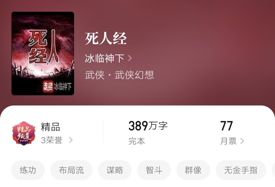 书评:网文中的基督山伯爵。哪怕后期转向争霸,但是依然不错。冰临神下的第一部作品《死人经》,是相当传统的武侠题材小说。虐主的武侠,不一样的武侠,江湖和朝堂相互呼应。