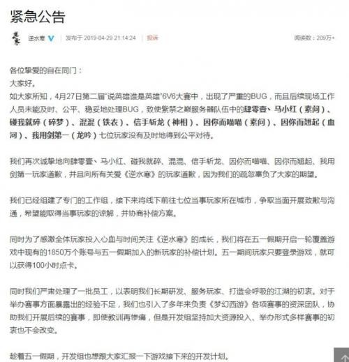 昨晚在PDD删号之前,逆水寒官方发布紧急公告,再次对此事做出说明并致歉。公告称:“后续现场工作人员未能及时、公平、稳妥地处理BUG,致使紫禁之巅服务器队伍中的肆零壹丶马小红(素问)、碰我就碎(碎梦)、混混(铁衣)、信手斩龙(神相)、因你而喵喵(素问)、因你而翘起(血河)、我用剑第一(龙吟)七位玩家没有及时地得到公平对待。因为我们的疏忽辜负了大家的期望。”并给出了组建了专门的工作组争取到七位玩家所在城市当面开展致歉与沟通,严肃处理了一批员工,以及给五一期间登录游戏玩家补偿的方案。
