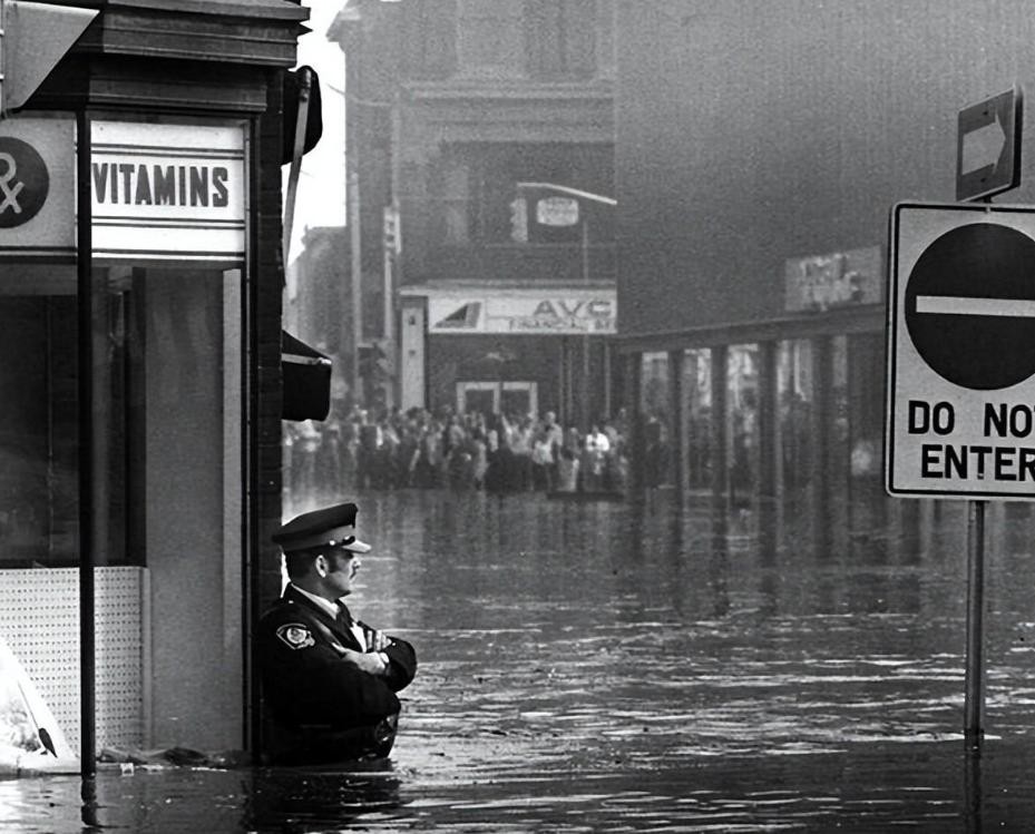 14.警察在洪水泛滥的水域守卫一家药房,稍不注意药房就会被洗劫一空。