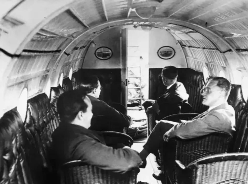 6.当时民航客机的头等舱,为了减重,座椅都是藤条编织的。当时发动机的功率小,机舱也不大,用这样的座椅也能带来更好、更安全的乘坐体验。