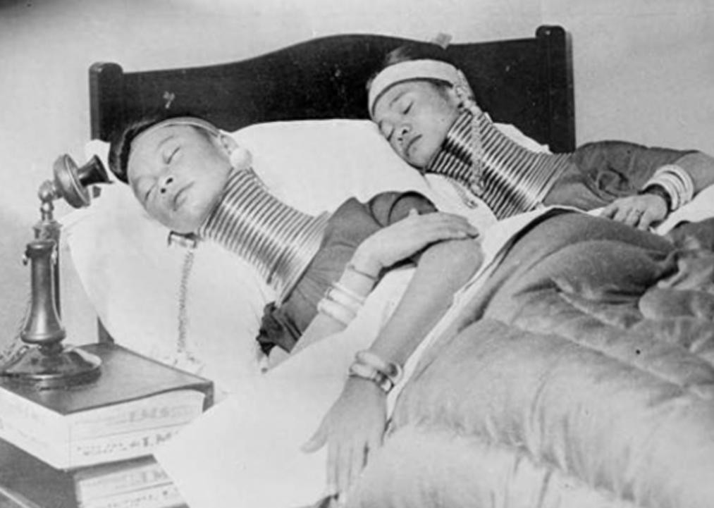 1.这是1935年,缅甸的长颈族女人,接受英国老板的邀请,到英国等地演出展示,这是她们在英国酒店休息的留影。