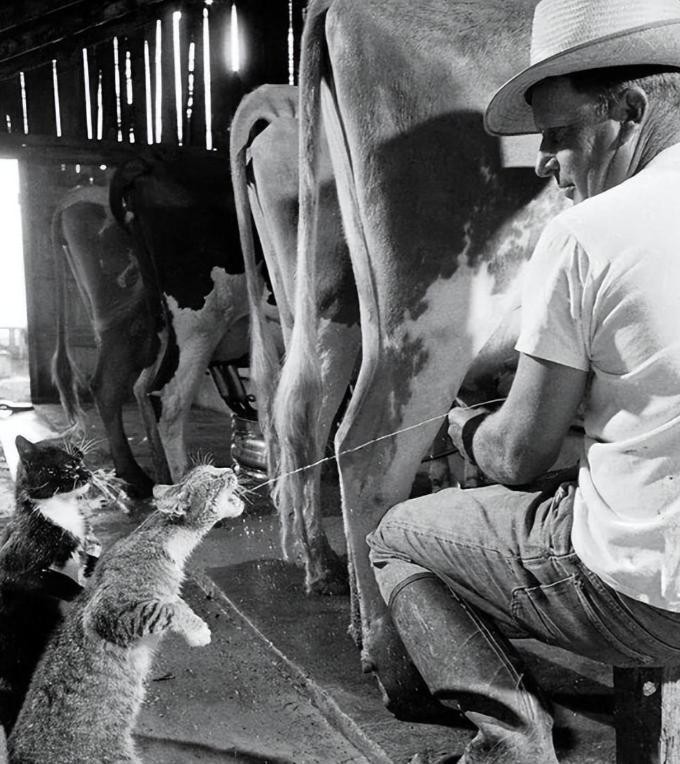 15.1954年的奶牛养殖基地之中,工作人员正在喂两只猫喝牛奶。话说这牛奶是真的新鲜,猫猫有口福了。