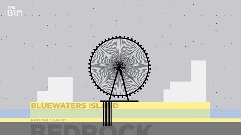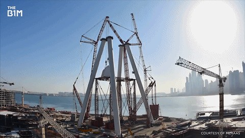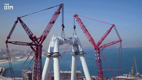 整体由4根直径6.5米,高126米的巨型塔柱组成,每一根的重量相当于两架A380大客机。这样夸张的长度和重量在运输和施工时的难度难以想象。为了纵向更加稳固,需要绕过填海土地深入地下35米。