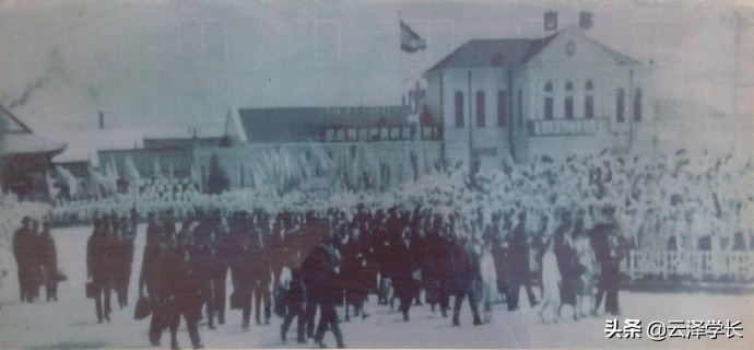 1934年10月24日11时许,伪满皇帝溥仪乘专列到吉林“巡狩”,图为当时吉林站前举行的迎接活动
