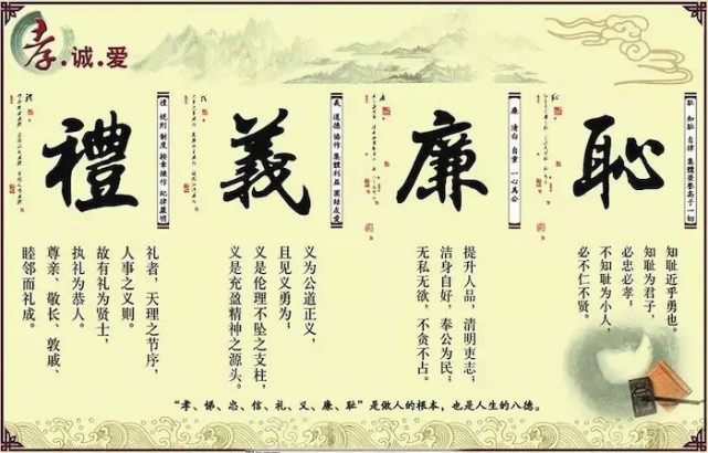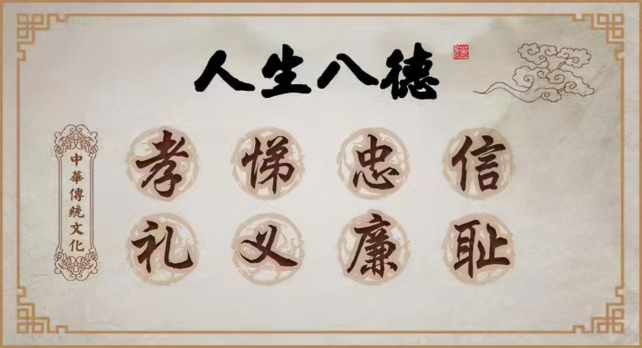 八德:孝、悌、忠、信、礼、义、廉、耻。