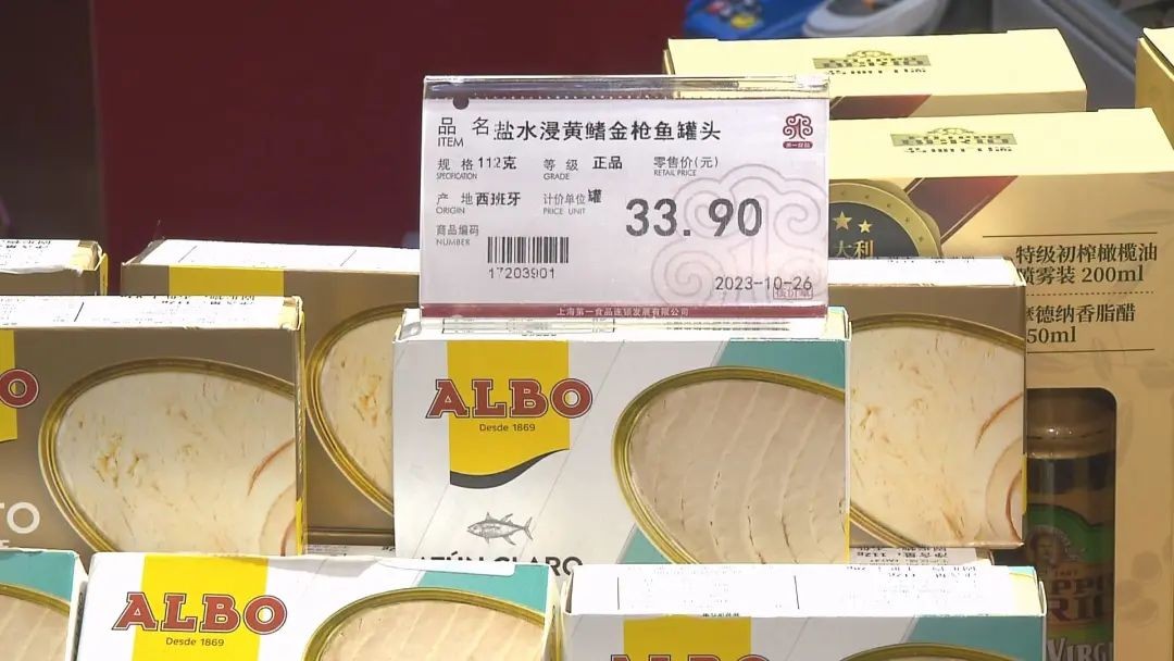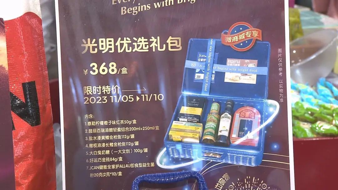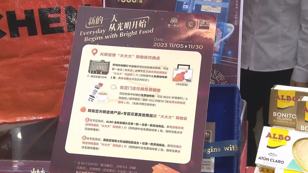 在进店显著位置记者看到,西班牙的金枪鱼、意大利的油醋等多种进口商品,以及第一食品“一食当家”的熟食、梅林的午餐肉和八宝饭罐头等光明集团旗下的老字号代表性商品把四周柜台摆放得满满当当,引得不少消费者驻足。市民成小姐告诉记者,在第一食品看到了进博会同款商品很惊喜,买了西班牙的金枪鱼罐头,也不贵。还买了光明集团的老字号品种,想不到还送了我一个“大大大”的包,很吸引人。
