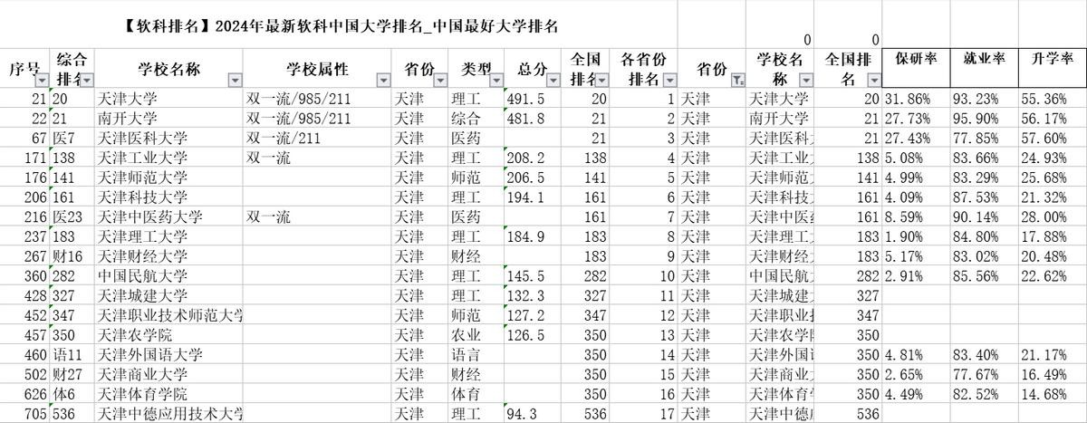 随着教育的快速发展,高校排名已成为衡量学校综合实力的重要指标之一。在天津地区,众多高校以其卓越的学术实力、良好的就业前景和保研升学率等因素,赢得了社会的广泛认可。本文将详细介绍天津地区几所知名高校在2024年全国排名中的表现,并分析其保研率、就业率和升学率等关键指标,以展现这些学校的综合实力和办学特色。