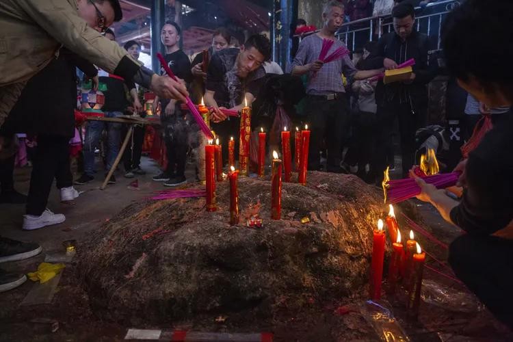 殿中有一块石头,是块灵石,是镇殿之宝。每位香客,都在该石上点烛烧纸。每年正月初一,必在殿内石上杀鸡滴血。