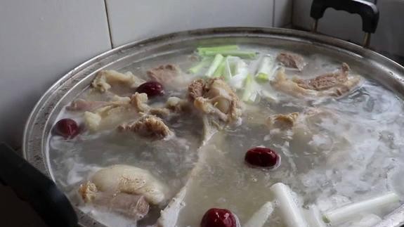 第二、羊肉汤还不能直接炖,还需经过焯水处理,洗好的羊肉羊骨头需要焯水处理,焯水时水量是要淹没羊肉。记住要点:羊肉一定要冷水下锅,让血水充分溶解。水中加入生姜片和大葱白、料酒辅助去腥,大火烧开以后,焯水3-5分钟的时间。