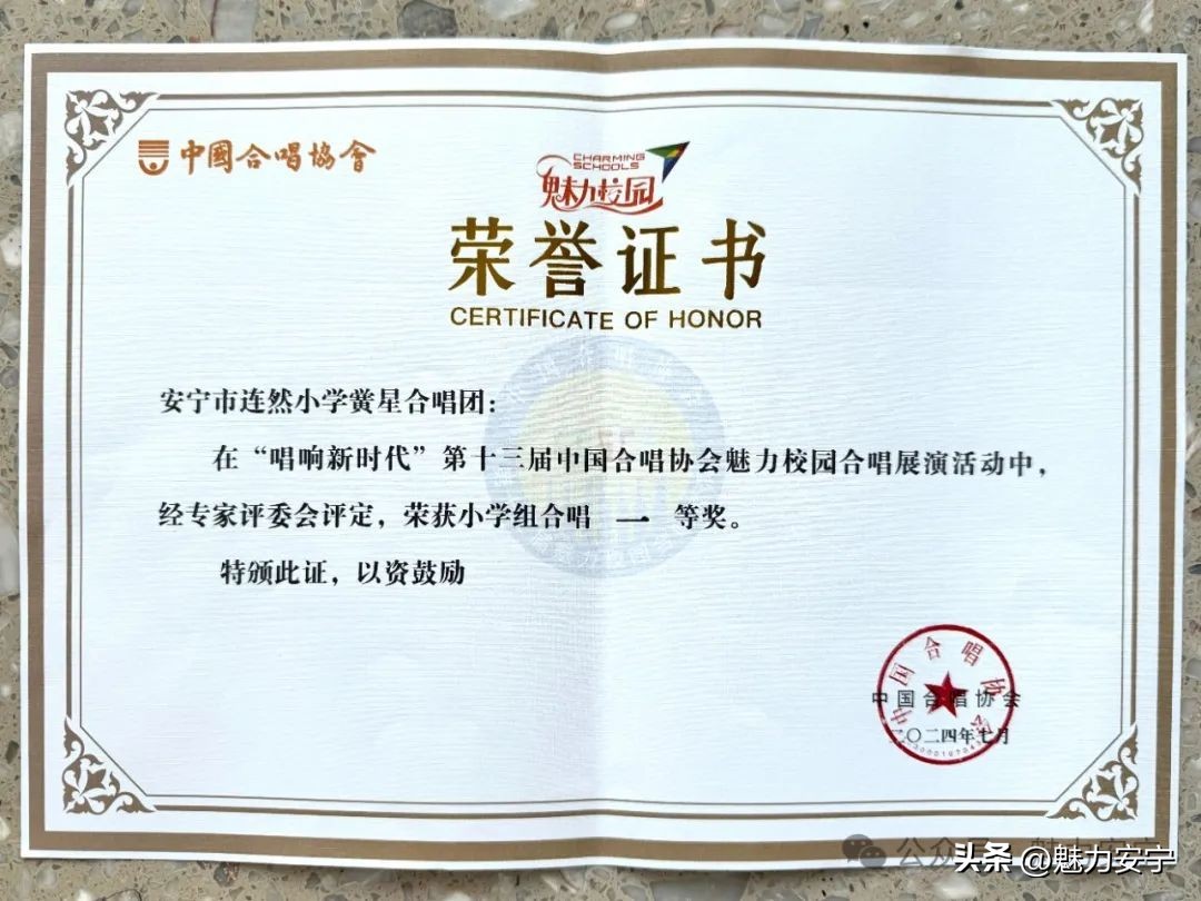 7月23日,安宁市连然小学“黉星”合唱团在第十三届中国魅力校园合唱展演中荣获小学组合唱一等奖。该展演由中国合唱协会主办,浙江省合唱协会协办,中国文学艺术基金会校园文化专项基金、北京东方复兴文化发展有限公司承办。来自全国各地78支优秀合唱队伍同台竞技。