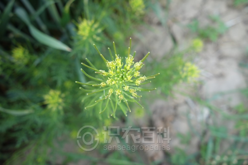 高20-80厘米,有毛或无毛,毛为叉状毛,以下部茎生叶为多,向上渐少。茎直立,分枝多,常于下部成淡紫色。叶为3回羽状深裂,长2-12 (-15) 厘米,末端裂片条形或长圆形,裂片长(2-) 3-5 (-10) 毫米,宽0.8-1.5 (-2) 毫米,下部叶具柄,上部叶无柄。花序伞房状,果期伸长;萼片直立,早落,长圆条形,背面有分叉细柔毛;花瓣黄色,长圆状倒卵形,长2-2.5毫米,或稍短于萼片,具爪;雄蕊6枚,比花瓣长三分之一。长角果圆筒状,长2.5-3厘米,宽约1毫米,无毛,稍内曲,与果梗不成1条直线,果瓣中脉明显;果梗长1-2厘米。种子每室1行,种子形小,多数,长圆形,长约1毫米,稍扁,淡红褐色,表面有细网纹。花期4-5月。