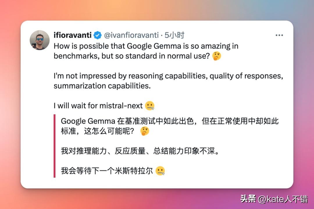 DeepMind 在博文和给出的动态图里展示的数据显示 Gemma 7B 性能出众;但一些博主不这么认为。