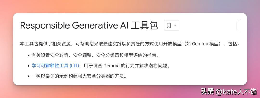 谷歌还提供了 Responsible Generative AI 工具包,为使用 Gemma 创建更安全的 AI 应用程序提供了指导和基本工具。