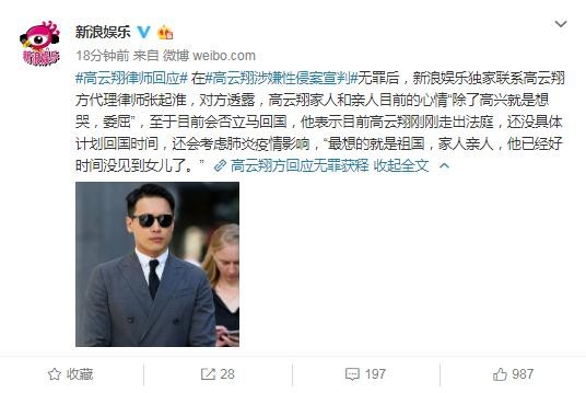 律师还透漏,高云翔家人和亲人目前的心情除了高兴就是想哭、委屈,至于目前是否立马回国,他表示目前高云翔刚刚走出法庭,还没具体计划回国时间,还会考虑肺炎疫情影响,“最想的就是祖国,家人亲人,他也已经好时间没见女儿了。”