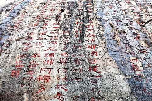 我们在登山过程中可以看到一大片石坪上刻着佛教经文的便是经石峪,它是我国现存最大的佛经摩崖刻石。其自东而西刻着的便是《金刚般若波罗蜜经》,共计44行,2799个字,历经千年风雨洗礼,现在我们仍可以看到41行1069个字,有大字鼻祖,榜书之宗美誉。