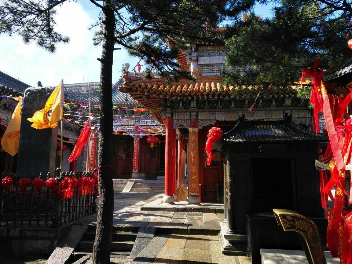 其正殿元君殿面阔五间,九脊歌山项,雕梁画栋,富丽堂皇。因山顶云雨多,材木易朽,故大殿采用的是金属和土木砖石相结合的材料,殿顶简瓦、吻、檐铃、垂兽等构件也是铜铸。殿上的瓦垄数是360,象征着中国旧历全年的“周天之数”。殿内元君像上方我们可以看到高悬雍正皇帝的“福线海宇”大型浮雕匾额,殿外门上方廊下还有乾隆帝的“赞化东皇”的大型浮雕匾额。