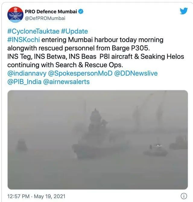 热带气旋“陶特”来袭之际,住宿/工作船“PAPAA-305”号在孟买海岸附近沉没,造成约127人失踪。印度海军表示,已经出动两艘船只和直升机展开搜寻。由于受气旋“陶特”猛烈风速影响,“P305”号本身没有动力,在风暴中失去控制并撞上了钻井平台,当地时间19点左右“P305”号进水沉没。