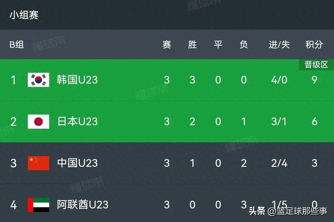 U23亚洲杯积分榜:中国2:1阿联酋夺历史第2胜,韩国1:0日本携手出线
