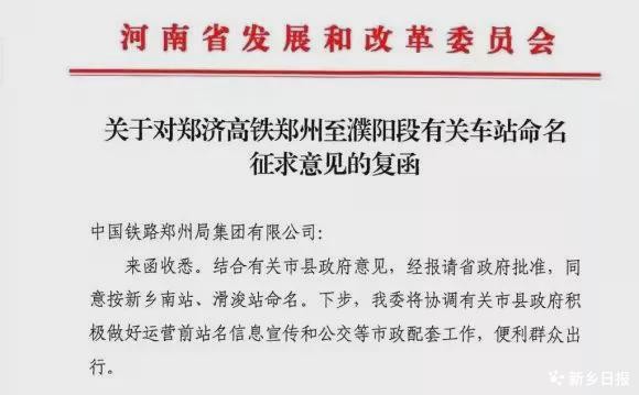 来函收悉。结合有关市县政府意见,经报请省政府批准,同意按新乡南站、滑浚站命名。下步,我委将协调有关市县政府积极做好运营前站名信息宣传和公交等市政配套工作,便利群众出行。