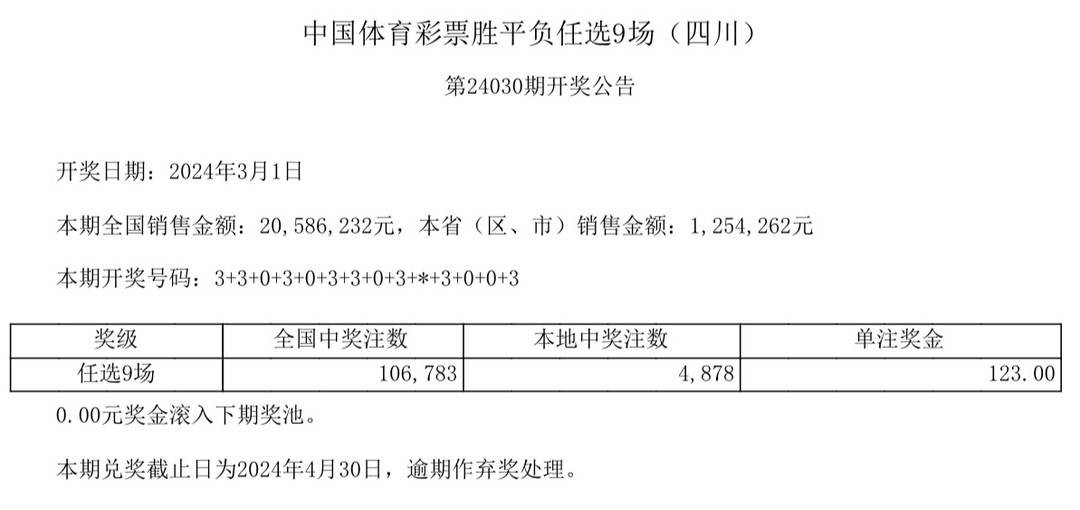 中国体育彩票胜平负任选9场第24030期全国销售金额:20586232元。开奖号码:3+3+0+3+0+3+3+0+3+*+3+0+0+3。