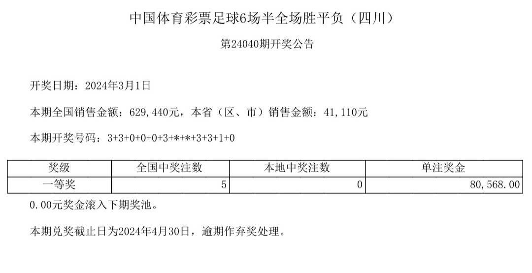 中国体育彩票足球6场半全场胜平负第24040期全国销售金额:629440元。开奖号码:3+3+0+0+0+3+*+*+3+3+1+0