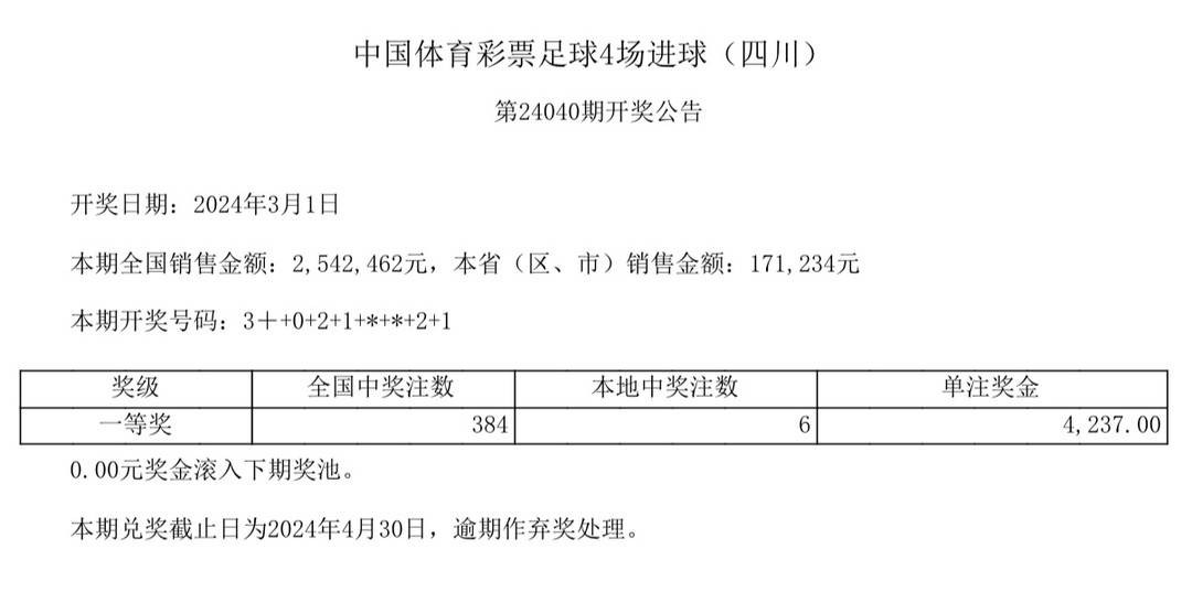 中国体育彩票足球4场进球第24040期全国销售金额:2542462元。开奖号码:3十+0+2+1+*+*+2+1。