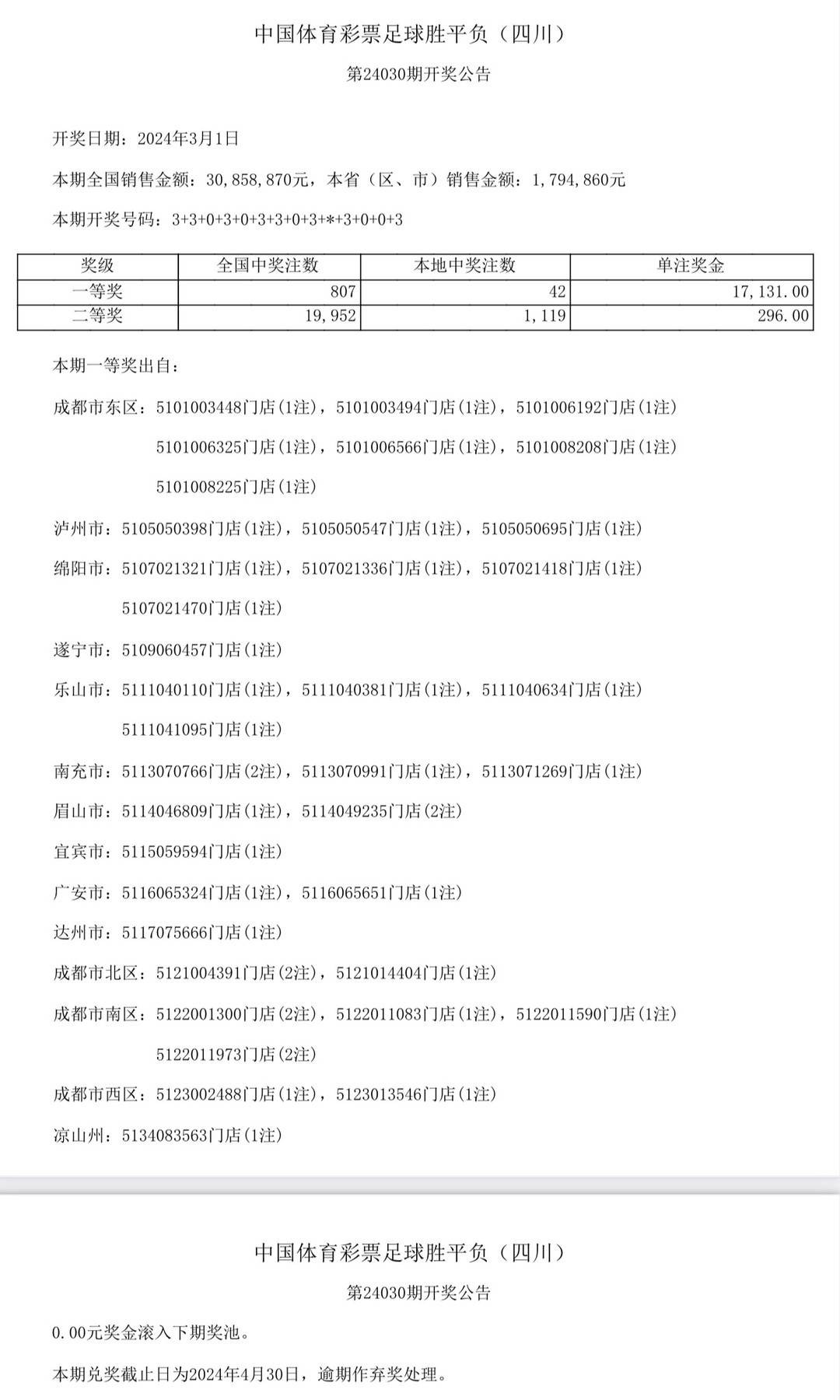 中国体育彩票足球胜平负第24030期全国销售金额:30858870元。开奖号码:3+3+0+3+0+3+3+0+3+*+3+0+0+3。
