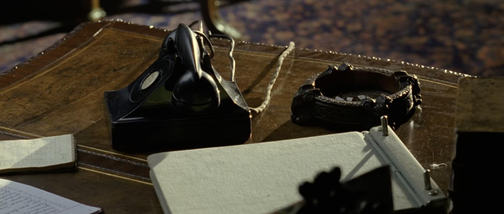 另一方面,紧急的电话铃声在影片中也出现了两次,用来构建故事进展的重大转折。第一次出现在霍华德激情满怀地祝福未来时,电话铃声带来了大萧条的消息;第二次时正在外地的霍华德接到儿子车祸的消息。实际上,影片通过电话实现转场并推进剧情的运用还有一处,那就是瑞德通过电话知道了海洋饼干受伤的消息。