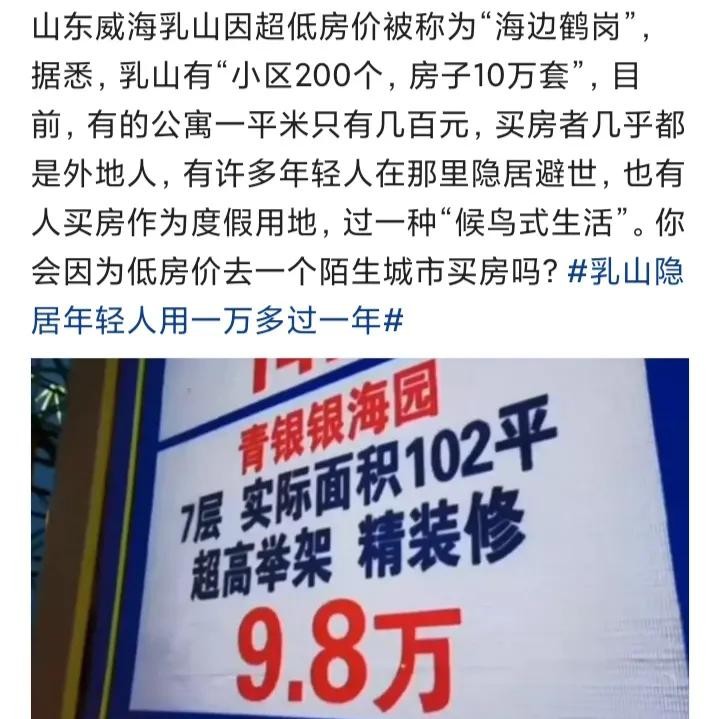 山东省乳山市近年来因低价海景房而出名,这里地理位置比鹤岗市好,环境优美,而且是海滨城市,被称为“海边鹤岗”。