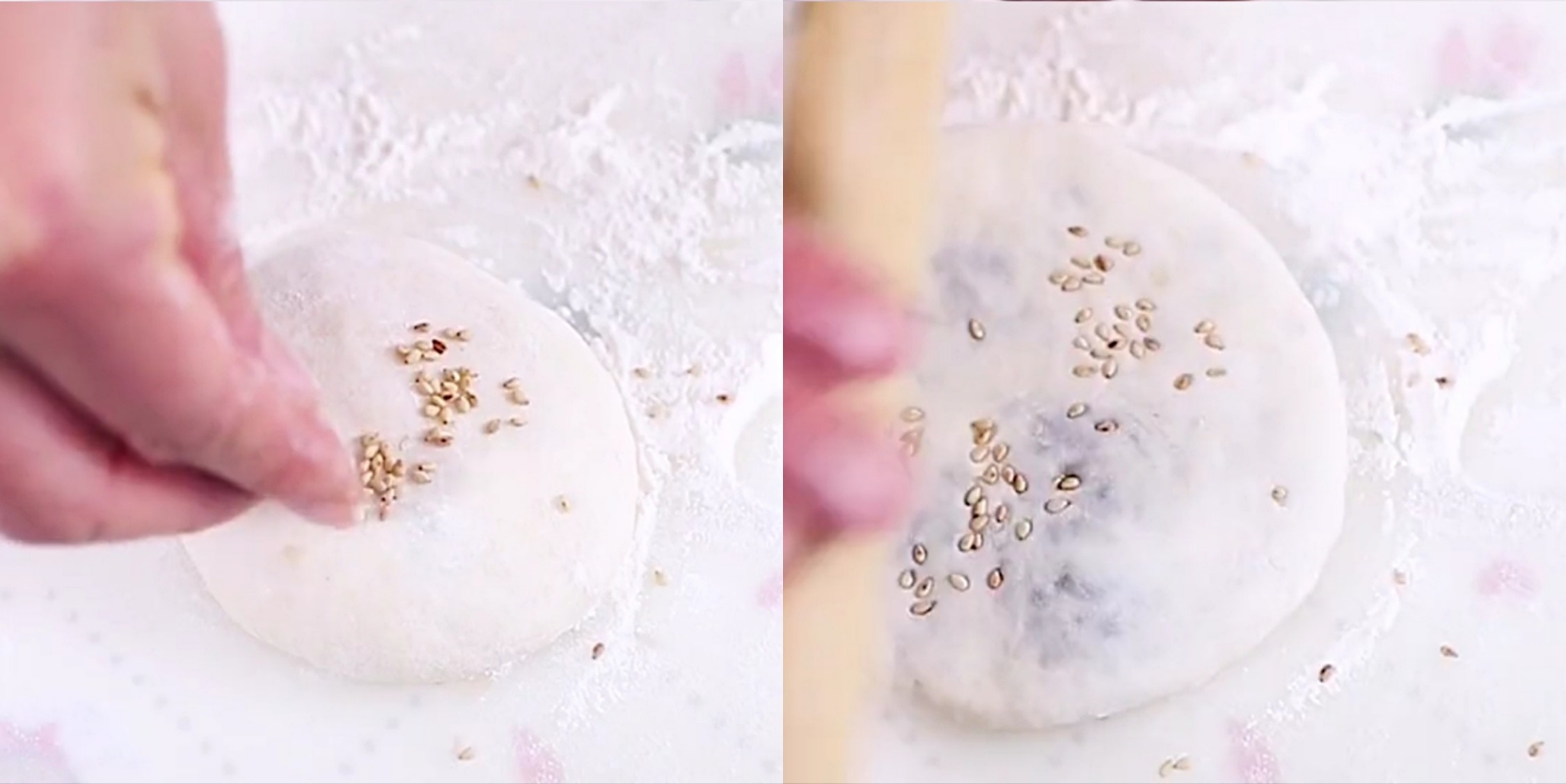 5、然后移到案板上按扁,表面撒上一撮白芝麻,用擀面杖擀开,擀成一个小圆饼,大小根据自己的喜好。