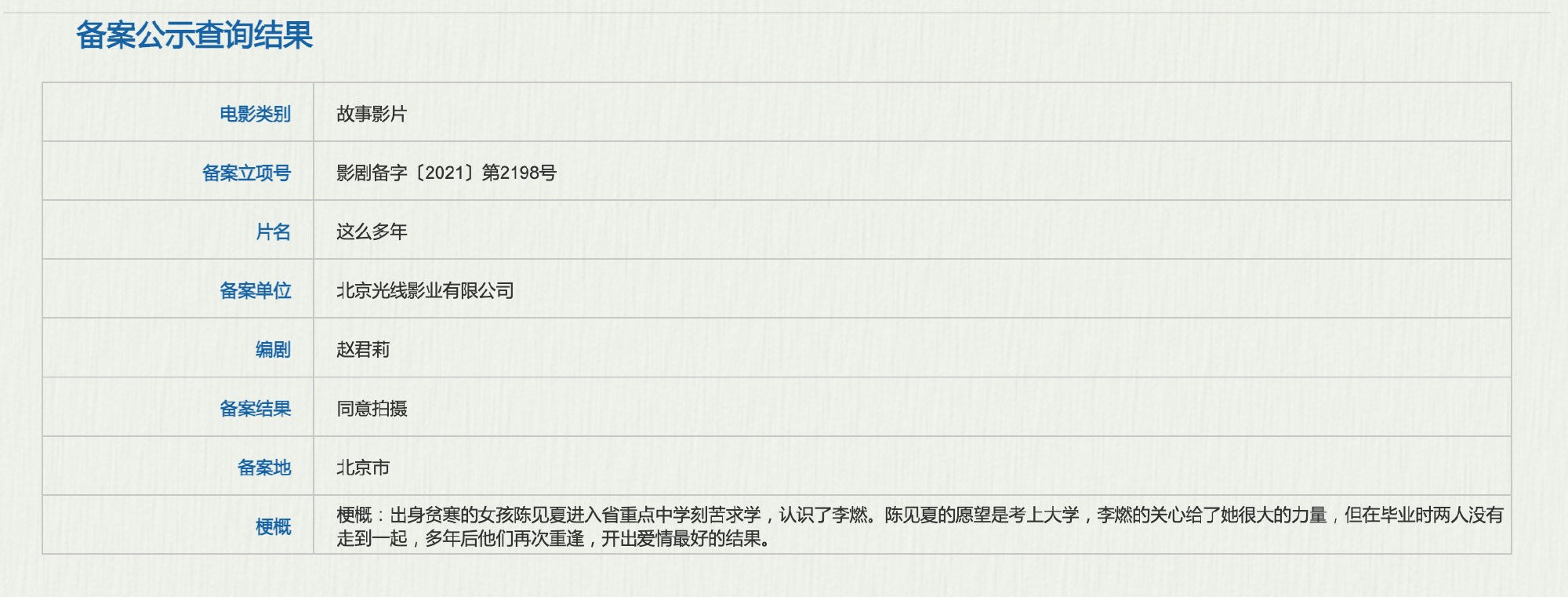 1905电影网讯 9月7日,根据国家电影局关于2021年7月全国电影剧本(梗概)备案、立项公示的通知显示,改编自八月长安同名新作的电影《这么多年》正式立项,由赵君莉担任编剧。小说《这么多年》于2021年8月14日正式出版,是八月长安“振华中学”系列的完结篇。