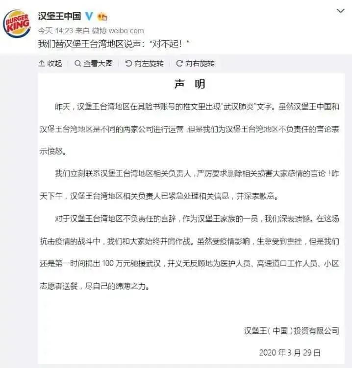 3月29日下午,汉堡王中国在其官方微博发声明:“我们替汉堡王台湾地区说声‘对不起’!”。