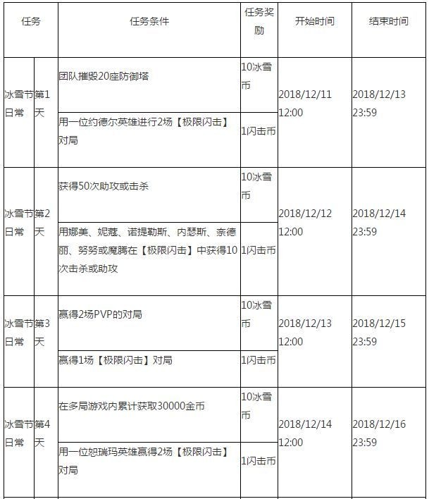 冬境乐园活动期间,自12月11日至1月10日,召唤师每天都将接到一个持续3天的每日任务。选择通过【极限闪击】地图任务条件完成任务,可额外获得闪击币奖励,可用于兑换极限闪击模式图标和特效奖励。