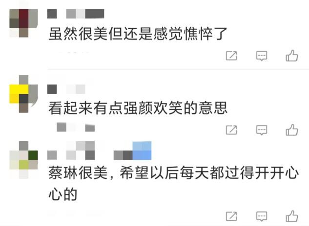 网友们在看到蔡琳这组最新动态照后在网上留言称"虽然很美,但还是感觉憔悴了",也有网友表示"看起来有点强颜欢笑的意思",也有贴心网友发表对她的祝福称"蔡琳很美,希望以后每天都过得开开心心"。