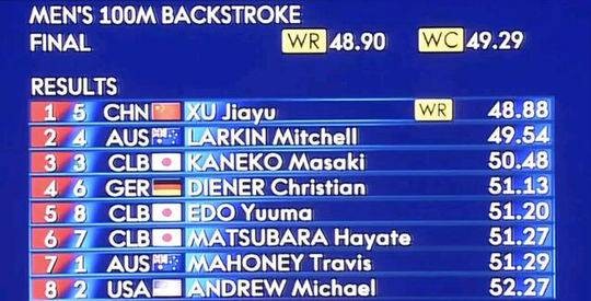 男子100米仰泳决赛,徐嘉余发挥出惊人水准,他在前半段就游出了23秒76,比俄罗斯选手克莱斯尼科夫在2017年创造48秒90世界纪录时的前半程都快了不少。后半程徐嘉余速度感保持得非常好,最后他以48秒88获得冠军,打破了克莱斯尼科夫48秒90的世界纪录!