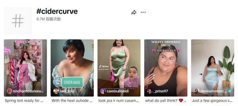 在大码女装专属#Cidercurve下该类视频已有870w的播放量!这还不包括部分大码女孩会直接将自己的视频放在主品牌#Ciderclothing或者是下的播放量。