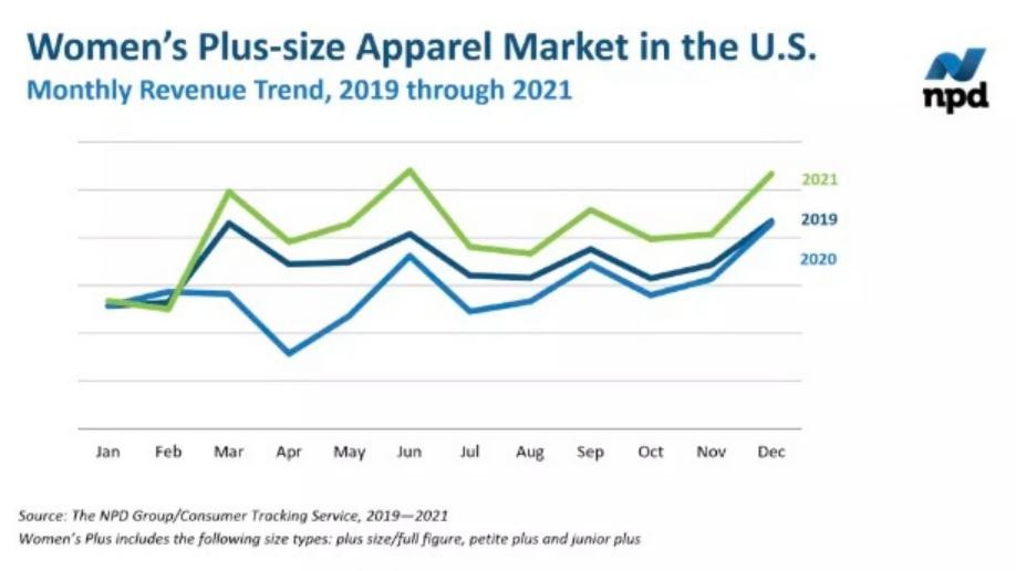 2021年,大码女装的在美国的销售份额比2019年增长了18%,增长速度是其余女装市场消费的三倍多。同时据华盛顿州立大学的一项调查显示,美国有75%的女性群体需要大码女装。