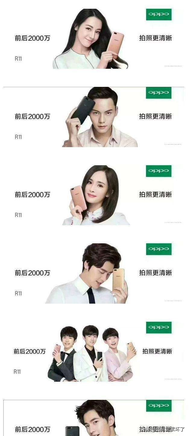 因为在2016年7月小米在发布红米Pro时一口气请了吴秀波、刘诗诗和刘昊然三位明星来代言,开了国产手机厂商大规模请明星代言的先例。于是2017年6月OPPO R11正式发布,一口气请了杨幂、李易峰、杨洋、陈伟霆、迪丽热巴和tfboys(王俊凯、王源和易烊千玺)一共8位代言人。在8位顶级流量明星的代言下,OPPO R11以其铺天盖地、狂轰滥炸式的宣传收获了极高的销量,成为当年度最佳畅销和最受欢迎的安卓旗舰之一。