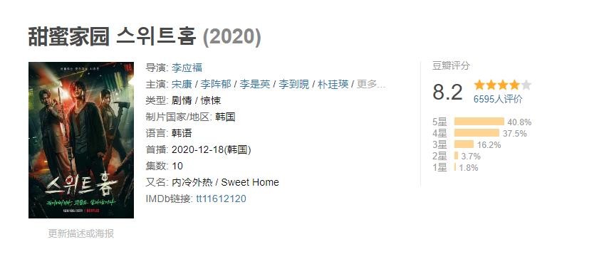 网飞似乎也看准了韩国这个题材的市场,不惜重金推出了这部《甜蜜家园》惊悚丧尸题材的连续剧。