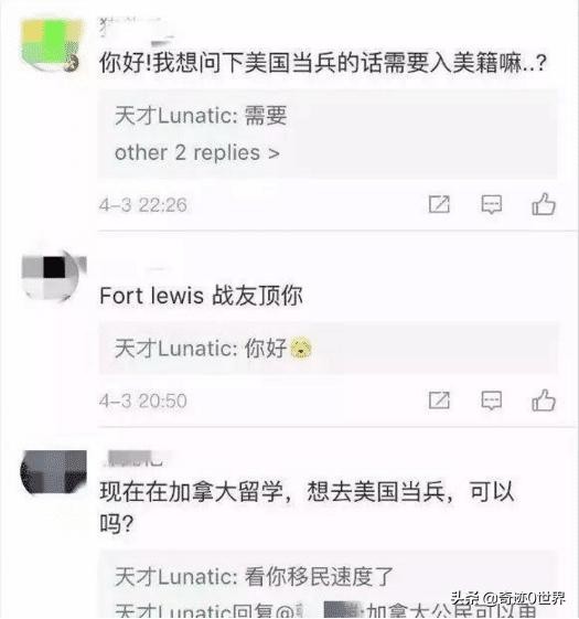 然后呢就是这样,高天才还是在国内社交平台上圈了一大波粉丝,注意是国内社交平台,甚至还有人羡慕他能够加入美军,夸她的人生真硬核呀,自己也想去加入美军了。让人说点儿啥好呢,你说!